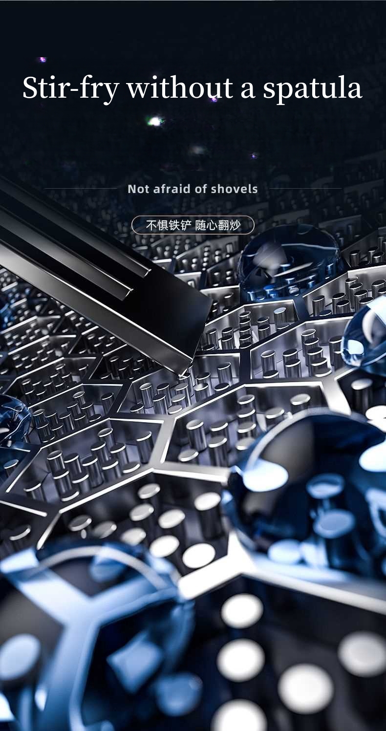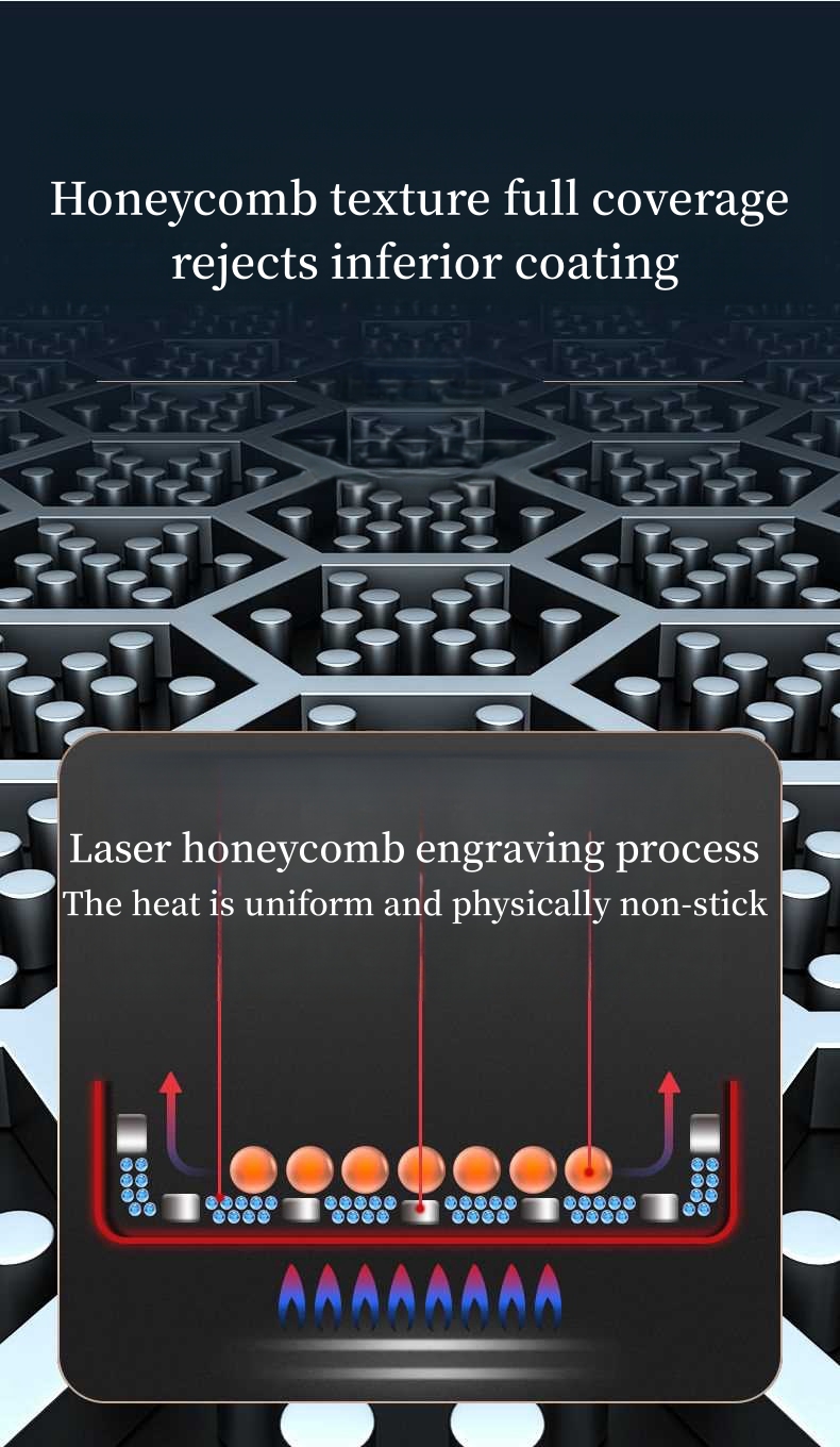 Внутренняя часть этой сковороды имеет сотовую текстуру, которая предотвращает контакт людей с антипригарным покрытием во время жарки. Трехслойная стальная конструкция обеспечивает равномерный нагрев кастрюли, что делает ее незаменимой кухонной утварью.