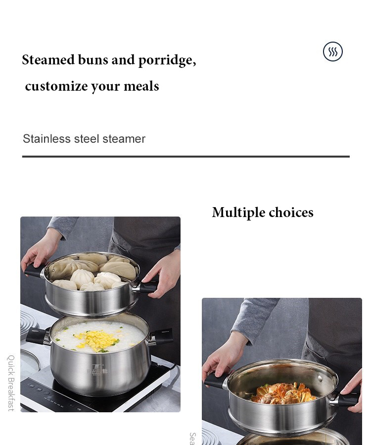 High Quality stainless steel cookware steamer soup sauce pot steamer is made of food-grade stainless steel, has 2 tier steamer pot to choose, which has strong chemical stability and is not easy to rust could be use for many years; Riveted Stainless Steel Handles,Ergonomic riveted stainless steel handle ensure a comfortable and secure grip.